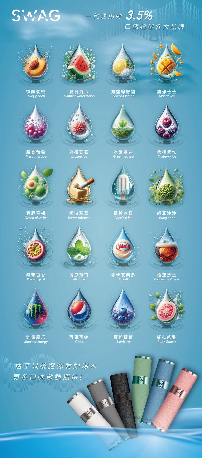 葡萄, 薄荷, 蜜桃, 養樂多, 可樂, 魔爪, 桑葚, 西瓜, 冰棍, 荔枝, 湮草, 綠豆, 百香, 芒果, 沙士, 青梅, 龍井, 檸檬海鹽, 芭樂, 藍莓